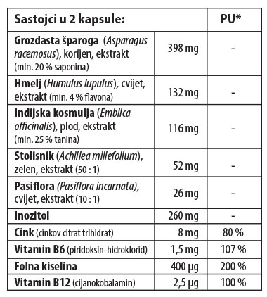 Sastojci: suhi ekstrakt korijena grozdaste šparoge, inozitol, suhi ekstrakt cvijeta hmelja, suhi ekstrakt ploda indijske kosmulje, suhi ekstrakt zeleni stolisnika, suhi ekstrakt cvijeta pasiflore, cinkov citrat trihidrat, tvar protiv zgrudnjavanja: magnezijev stearat biljni, piridoksin-hidroklorid, folna kiselina, cijanokobalamin, celulozna kapsula, bojilo: crveni željezov oksid.